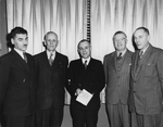 Description :CINQ HOMMES DEBOUT COTE-A-COTE, PORTANT VESTON ET CRAVATE PRENNENT LA POSE, DE GAUCHE A DROITE; ALFRED DESROCHERS, J.D. DUFOUR, L.-P. ROBIDOUX, LUCIEN HEBERT, DR CHARLES LEBLANC. L.-P. ROBIDOUX TIENT A LA MAIN UN EXEMPLAIRE DE SON OUVRAGE "FEU...