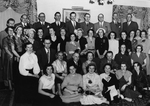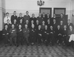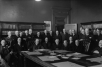 Description :UN GROUPE DE 32 HOMMES PORTANT VESTON ET CRAVATE PRENNENT LA POSE DANS UNE SALLE DE REUNION. DE GAUCHE A DROITE, ASSIS: L.-P. ROBIDOUX, DALMA LANDRY, CESAIRE GERVAIS, -- , C.B. HOWARD, LETOURNEAU, SANGSTER, MAURICE GINGUES, LEOPOLD CHEVALIER, ...