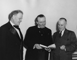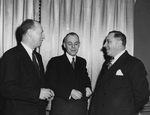 Description :3 HOMMES DISCUTENT. ILS SONT PHOTOGRAPHIES A PARTIR DU TORSE. ILS PORTENT VESTON ET CRAVATE. DE GAUCHE A DROITE: CESAIRE GERVAIS, LOUIS-PHILIPPE ROBIDOUX ET ALPHONSE TRUDEAU, MAIRE.