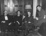 Description :DE GAUCHE A DROITE, ASSIS DANS UNE CHAISE A 3 PLACES: ME LEONIDAS BACHAND, --, M. LOUIS-PHILIPPE ROBIDOUX. A COTE D'EUX, APPUYE SUR UN MEUBLE, ALFRED DESROCHERS SOURIANT, SON CALEPIN A LA MAIN.