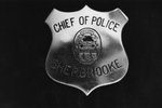 Description :LA BADGE PORTE L'INSCRIPTION "CHIEF OF POLICE SHERBROOKE". ELLE EST PHOTOGRAPHIEE SUR FOND NOIR.