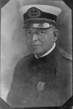 Description :PHOTO EN BUSTE D'A-Z. COUTURE. IL PORTE LE CASQUE DE POLICIER ET LE BADGE, SUR SON VESTON NOIR.