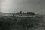 Description :LE SOUBASSEMENT DE L'EGLISE, EN PLEIN CHAMP. A L'ARRIERE-PLAN, LE PRESBYTERE ET UNE FERME.