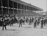 Description :UNE FANFARE CIRCULE DEVANT L'ESTRADE BONDEE DE L'E.T.A.A.