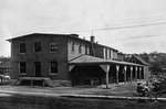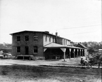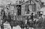 Description :LE BATIMENT DE BRIQUES DE 2 ETAGES EST MONTRE PRES D'UN CHEMIN DE TERRE BATTUE. DEUX CHARRETTES ATTELEES A DES CHEVAUX SONT VISIBLES A DROITE ET A GAUCHE DE L'EDIFICE.