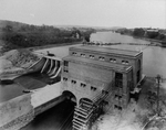 Description :AU CENTRE, LA CENTRALE MEMPHREMAGOG AVEC UNE SERIE DE FILS QUI QUITTENT UNE OUVERTURE ET SONT RATTACHES A UN POTEAU. A GAUCHE, LE BARRAGE. A L'ARRIERE, LE RESERVOIR DE RETENUE. AU LOIN, LE VILLAGE DE MAGOG.