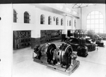 Description :AU CENTRE DE LA PHOTO, UNE TURBINE A AXE HORIZONTAL PUIS UNE SERIE D'APPAREILS. A GAUCHE, PANNEAU ELECTRIQUE SURMONTE D'UNE GALERIE DE BETON AVEC OUVERTURES EN ARC. A DROITE, IMMENSE FENETRE A CARREAUX EN ARRONDI.