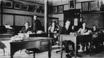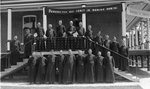 Description :RANGEE D'ABBES SUR UNE GALERIE QUI DESCEND DE CHAQUE COTE. UNE AUTRE RANGEE EST DEVANT LA GALERIE. L'ABBE MAURICE O'BREADY EST AU CENTRE SUR LA GALERIE. DES BANDEROLES PORTANT DES MESSAGES EN LATIN SONT SUSPENDUES AUX COLONNES DE LA GALERIE.