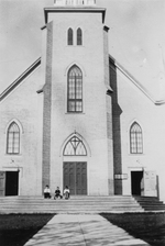 Description :VUE DE FACE DE L'EGLISE DE ST-ADOLPHE DE DUDSWELL. TROIS PERSONNES NON IDENTIFIEES ASSISES SUR LE PERRON.