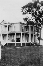 Description :EN GROS PLAN, PRESBYTERE DE ST-ADOLPHE DE DUDSWELL, A COTE UN ARBRE TRES HAUT. UN GRAND TERRAIN EN AVANT DU PRESBYTERE ET AU BAS DE LA PHOTO IL Y A UNE CLOTURE. 2 HOMMES SUR LA GALERIE DU PRESBYTERE: CELUI DE GAUCHE, HERMINI DUBUC ET A COTE, U...