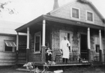 Description :DEVANT LA MAISON DE CYRIAS PELLETIER. SUR LA GALERIE A GAUCHE UN PETIT GARCON NON IDENTIFIE, LA DAME QUI A LA MAIN SUR LA PORTE MME CYRIAS PELLETIER, AU BAS DES MARCHES L'HOMME A GAUCHE, J.H. DUBUC PTRE ET CELUI A SES COTES M. CYRIAS PELLETIER...