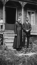 Description :3.1: EN GROS PLAN, A GAUCHE HERMINI DUBUC ET A DROITE MARIA LACHANCE. EN ARRIERE PLAN A GAUCHE, LE PRESBYTERE (?) ET A DROITE UNE EGLISE. 3.2: VU DE BIAIS, LE PRESBYTERE (?) ET A DROITE L'EGLISE.