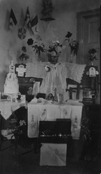 Description :SUR UNE TABLE SONT DEPOSES TOUS LES CADEAUX D'ORDINATION. EN ARRIERE PLAN ON VOIT TROIS DRAPEAUX ACCROCHES AU MUR, UN DU QUEBEC ET DEUX DRAPEAUX DU VATICAN; PLUSIEURS FLEURS. A GAUCHE SUR UNE PETITE TABLE LE GATEAU D'ORDINATION D'HERMINI DUBUC...