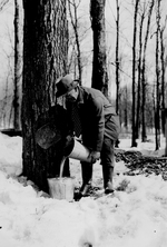 Description :3.1: UN HOMME NON IDENTIFIE VIDE L'EAU D'ERABLE DANS UNE CHAUDIERE. IL FAIT LA CUEILLETTE. 3.2: VUE DE COTE, LA BELLE CABANE A SUCRE. LA SEVE EST EN TRAIN DE BOUILLIR. ON VOIT DE LA VAPEUR SORTIR DU TOIT. QUELQUES ARBRES ONT DES CHAUDIERES ACC...