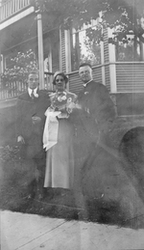 Description :LES MARIES SONT A GAUCHE. HERMINI DUBUC ACCOMPAGNE DE DEUX AUTRES RELIGIEUX EST A DROITE. D'AUTRES PERSONNES SONT PRESENTES. LA PHOTO EST PRISE DEVANT UNE MAISON.