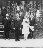 Description :LES MARIES EN AVANT, EN ARRIERE, AU CENTRE, LE CURE HERMINI DUBUC ET DEUX HOMMES DE CHAQUE COTE DES MARIES. LE GROUPE EST DEVANT UNE GALERIE SUR LAQUELLE MONTE DU LIERRE GRIMPANT.