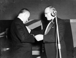Sujet principal :LOUIS-PHILIPPE ROBIDOUX RECOIT LES PALMES D'OFFICIER D'ACADEMIE DES MAINS DU COMTE JEAN DE HAUTECLOCQUE, AMBASSADEUR DE FRANCE AU CANADA.