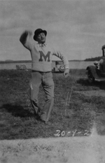 Description :4.1: GERARD PLAMONDON QUI FAIT UNE PETITE DANSE PRES DE SON AUTO ET AU LOIN EN VOIT LE LAC. IL PORTE UN CHANDAIL AVEC UN GROS M IMPRIME DESSUS ET UN CHAPEAU MELON. 4.2: GROUPE DE PERSONNES QUI JASENT ENTRE ELLES. HERMINI DUBUC EST A GAUCHE DAN...