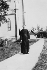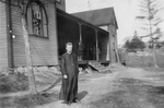 Description :A L'AVANT-PLAN, HERMINI DUBUC EN SOUTANE DE SEMINARISTE. DERRIERE LUI, UNE MAISON A DEUX CORPS RELIES PAR UNE GALERIE.