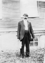 Description :MONSIEUR WILFRID LEMAY A COTE DE SA MAISON. IL TIENT DE SA MAIN DROITE DES PINTES DE LAIT ET A SA MAIN GAUCHE IL A UNE CIGARETTE. IL A UNE MOUSTACHE, UN CHAPEAU ET DES LUNETTES.