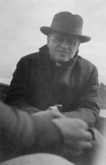 Description :PORTRAIT DE HERMINI DUBUC. IL PORTE UN CHAPEAU NOIR ET DES LUNETTES. IL A UN MANTEAU NOIR. PHOTO PRISE LORS D'UNE EXCURSION SUR LE LAC AVEC BOULOTTE, LEMELIN, J.B. DURAND, E. ROUSSEAU ET HERMINI DUBUC.