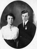 Description :PHOTO EN BUSTE D'UN COUPLE; A GAUCHE LA JEUNE FILLE PORTE UNE BLOUSE BLANCHE ET A DROITE L'HOMME EST EN HABIT NOIR.