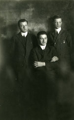 Description :TROIS HOMMES VETUS DE NOIR PRENNENT LA POSE. CELUI DU CENTRE A LES BRAS CROISES.