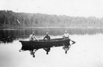 Description :ALBINI, ALPHONSE ET HERMINI DUBUC DANS UNE CHALOUPE SUR UN LAC. ALPHONSE ET ALBINI ONT UNE CANNE A LA MAIN TANDIS QU'HERMINI RAME.
