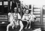 Description :7.1: ASSIS SUR LA GALERIE DE LA MAISON, HERMINI DUBUC A GAUCHE AVEC UN CHAPEAU SUR LA TETE TIENT SUR LUI UNE PETITE FILLE QUI PORTE UNE ROBE BLANCHE. 6 AUTRES PERSONNES AVEC LUI. HOMMES, FEMMES ET ENFANTS. 7.2: QUATRE HOMMES PRETS POUR UNE PAR...
