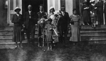 Description :SEPT PERSONNES PRENNENT LA POSE DEVANT LES MARCHES D'UNE RESIDENCE: LES MARIES, LES PARENTS DES MARIES ET LA BOUQUETIERE. LES MARIES SONT ENROULES DE SERPENTINS.
