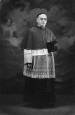 Description :PHOTO DE PIED EN CAP D'UN PRETRE NON IDENTIFIE. IL TIENT SA BARRETTE A LA MAIN. IL PORTE SOUTANE ET SURPLIS.