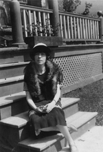 Description :EVA DUBUC ASSISE SUR LES ESCALIERS A L'EXTERIEUR D'UNE MAISON. ELLE A UN CHAPEAU SUR LA TETE ET UNE FOURRURE LUI ENTOURE LES EPAULES.