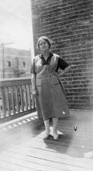 Description :CELANIRE DUBUC DEBOUT SUR SA GALERIE. EN ARRIERE DE LA BRIQUE ET A GAUCHE DE LA PHOTO, UN EDIFICE A LOGEMENT.