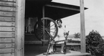 Description :CELANIRE DUBUC EN TRAIN D'OPERER SON ROUET SUR SA GALERIE.
