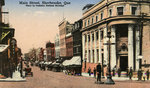 Description :LA PHOTO EST PRISE AU CARREFOUR KING-WELLINGTON ET MONTRE LA RUE WELLINGTON NORD, COTE EST. A L'AVANT-PLAN, LE GROS EDIFICE DE PIERRE DE LA BANQUE DE COMMERCE, AVEC SON PORCHE A COLONNES. ON DISTINGUE AUSSI, LA FACADE DU RESTAURANT OLIVIER, S...
