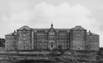 Description :VUE DE L'IMPOSANT EDIFICE AVEC PLUSIEURS AILES DONT 3 FAISANT SAILLIE, CLOCHE AU CENTRE. DE PLAN RECTANGULAIRE, IL POSSEDE UN TOIT EN TOLE A BAGUETTES.