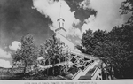 Description :EN AVANT-PLAN, LA GRANDE CHAPELLE TRIANGULAIRE AVEC SES ESCALIERS ET SON CLOCHER QUI SE DRESSE DANS LE CIEL, ENTOUREE D'ARBRES. A GAUCHE, DERRIERE UN ARBRE, L'ANCIENNE CHAPELLE EST UN PEU MASQUEE.