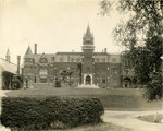 Description :FACADE DE L'UNIVERSITE BISHOP'S A LENNOXVILLE LARGE EDIFICE A 3 ETAGE AVEC TOURS AU CENTRE, FAIT DE BRIQUES ROUGES, MOTIF AUTOUR DES FENETRES, LE HAUT EN BARDEAU GRIS.