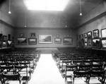 Description :VUE DE L'INTERIEUR DE LA SALLE DES ARTS. SUR LES MURS 32 PEINTURES ENCADREES. AU CENTRE, EN AVANT UNE ESTRADE, PLUSIEUR RANGEES DE CHAISES. AU PLAFOND, UNE GRANDE FENETRE, UN PUITS DE LUMIERE, LAISSE PASSER LA LUMIERE. AUX 4 COINS DE LA FENETR...