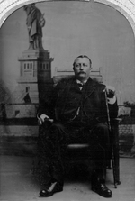 Description :1.1: GEORGINE CAMIRAND-BACHAND ET LEONILDE-CHARLES BACHAND POSENT DEVANT UNE TOILE REPRESENTANT LA STATUE DE LA LIBERTE. 1.2: LEONILDE-CHARLES BACHAND EST PHOTOGRAPHIE SEUL, ASSIS DEVANT LA MEME TOILE.
