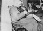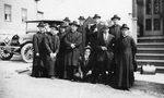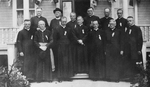 Description :GROUPE D'ECCLESIASTIQUES REUNIS A DISRAELI POUR FETER LES NOCES D'ARGENT DE M. LE CURE J.A. LEMAY. A GAUCHE HERMINI DUBUC, 2E 1ERE RANGEE, L. LEGUERRIER, VICAIRE, 3E, M. CARRIER, CURE DE GARTHBY, 4E D. RICHARD, CURE A ST-JULIEN, 5E A. LEMAY, C...