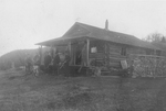 Description :LES ABBES EMILE POULIN, ANTONIO DUPUIS, IRENE JACQUES, HERMINI DUBUC, JOS FORTIN, EUGENE VALENCE, DONAT JACQUES AVEC LEUR FUSIL A LA MAIN. ILS SONT EN AVANT D'UN CHALET EN BOIS ROND.