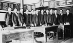 Description :PHOTO DE FINISSANTS "CLASSE D'AFFAIRES." 12 ETUDIANTS DU COURS COMMERCIAL DANS UNE CLASSE; PLACES DEBOUT UN A COTE DE L'AUTRE. 1ER A GAUCHE ALBERT MCCLURE, 2E MAURICE POULIOT, 3E PAUL-EMILE GENDRON, 4E GORDON BRADFORD, 5E MAURICE GIROUARD, 6E ...