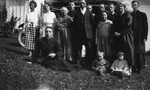 Description :14 PERSONNES SONT ASSEMBLEES FACE A LA RESIDENCE DE M. GILLES COMTOIS. M. COMTOIS EST EN PLEIN CENTRE. PLUSIEURS ECCLESIASTIQUES APPARAISSENT SUR LA PHOTO DONT HERMINI DUBUC 2E A DROITE AU DERNIER RANG. ON APERCOIT LA VOITURE FAMILIALE EN PART...