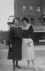 Description :2O.1: A DROITE EVA BOURGAULT QUI TIENT SA COPINE EVA DUBUC PAR LA TAILLE. ELLES SONT DEVANT LE MAGOG HOUSE A SHERBROOKE. 2O.2: A GAUCHE EVA BOURGAULT VETUE D'UN COSTUME CARRELLE ET D'UNE CRAVATE ET A DROITE EVA DUBUC VETUE D'UNE FOURRURE ET D'...