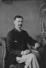 Description :HOMME NON IDENTIFIE, MEMBRE DE LA FAMILLE BACHAND, ASSIS ET ACCOUDE SUR UNE TABLE EN OSIER.