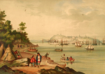 Description :QUELQUES AMERINDIENS ET COLONS INSTALLES SUR UNE POINTE DE TERRE A LEVIS OBSERVENT LE VIEUX PORT DE QUEBEC ET LES PLAINES D'ABRAHAM