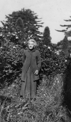 Description :UNE DAME AGEE PORTANT GRANDE ROBE NOIRE ET GRAND GILET NOIR. DERRIERE, DES ARBRES.