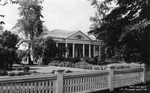 Description :MAISON AVEC TOIT A CROUPE, LUCARNES, COLONNES. DES ARBRES FEUILLUS ORNENT LE TERRAIN. CLOTURE OUVRAGEE EN AVANT-PLAN