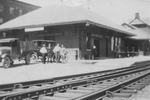 Description :BATISSE AVEC TOIT A QUATRE PANS. L'AFFICHE CANADIAN NATIONAL EXPRESS CO. EST ACCROCHEE A L'EDIFICE. UNE VIEILLE AUTOMOBILE ET UN VIEUX CAMION SONT STATIONNES PRES DE LA GARE. 5 PERSONNES SONT PRESENTES SUR LA PHOTO. A L'AVANT-PLAN LES RAILS DE...